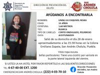 Desaparece Linda de 15 años en San Andrés Cholula Municipios PueblaViernes, Enero 29, 2021 - 07:53Salió de su domicilio aproximadamente a las 15:00 horas en la colonia Emiliano Zapata y ya no regresóLeer más
