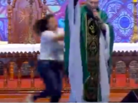 VIDEO En plena misa Mujer avienta a sacerdote de escenario Lunes, Julio 15, 2019 - 09:30La mujer rompió la seguridad para posteriormente subir al escenario y después arremeter en contra del sacerdote que se encontraba ofreciendo una misa frente a 50 mil asistentes.Leer más