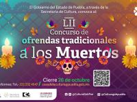 Cultura emite convocatoria Concurso Artístico de Altares y Ofrendas a los Muertos Municipios PueblaDomingo, Octubre 2, 2022 - 15:08El periodo de inscripciones finaliza el 26 de octubre, las ofrendas serán exhibidas del 29 de octubre al 02 de noviembreLeer más